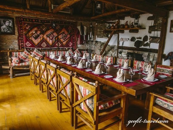 The many artefacts placed in and around the restaurant serve as an illustration of Georgia's history. Among them one can even notice 20th-- century copies of sculptures by Georgian art legend Niko Pirosmani. At the same time, everything remains very tasteful and without any kind of pseudo-national kitsch.
